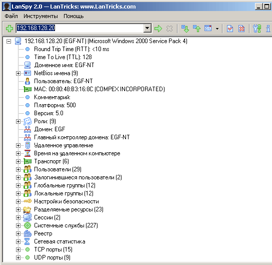 LanSpy — это сканер безопасности для исследования сети. Осуществляет сбор информации о компьютере: Доменное и NetBios имена, MAC-адрес, Сетевые адаптеры, Пользователи, Настройки безопасности, Разделяемые ресурсы, Сервисы, Информация из Реестра и Журнала событий, Сканер портов и многое другое. В программу включён сканер портов, который определит сервисы для открытых портов на удалённом компьютере и соберёт отклики для каждого сервиса.