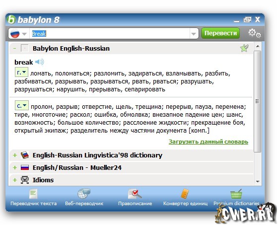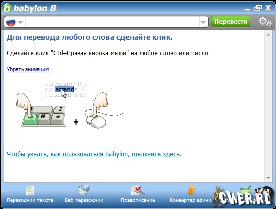 Babylon 8 - словарь, позволяющий переводить слова с одного языка на другой. Работать со словарем очень просто - после нажатия кнопкой мыши на интересующее слово появляется окно с его переводом. Кроме перевода слов, программа включает в себя английские тематические и толковые словари, а также имеет функции конвертации валют на текущую дату и перевода мер из одной системы в другую. Кроме словаря, который можно использовать в любое время, при онлайн-работе, Babylon позволяет воспользоваться огромными базами данных, сосредоточенными в таких глоссариях, как Britannica, Amazon, Accuweather и другие. Теперь вам не потребуется много времени на исправление орфографических ошибок и на поиск правильного слова или перевода. С данной программой читать и писать на всех языках гораздо проще, быстрее и эффективнее. Программа делает всю работу за вас, при помощи проверки орфографических ошибок в реальном времени, умного переводчика на любой язык и с любого языка, а также автоматического подбора выражений.