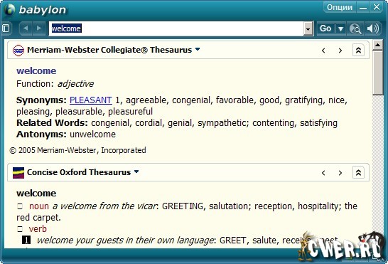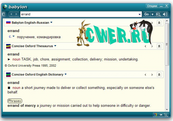 Babylon - словарь, позволяющий переводить слова с одного языка на другой. Работать со словарем очень просто: после нажатия кнопкой мыши (какой кнопкой - настраивается) на интересующее слово появляется окно с его переводом. Кроме перевода слов, Babylon включает в себя тематические и толковые словари, а также имеет функции конвертации валют на текущую дату и перевода мер из одной системы в другую.