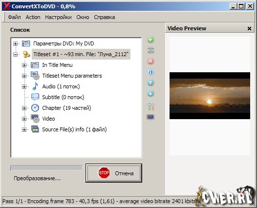 ConvertXtoDVD - программа предназначена для преобразования видео в формат, совместимый с DVD Video, и последующей записи содержимого на DVD. Программа поддерживает видеофайлы Mpeg, Mpeg, Mpeg4, MP4, VOB, WMV, DV, AVI, а также потоковое видео. Для работы программы не нужны внешние AVI-кодеки, поскольку она использует собственные. ConvertXtoDVD может автоматически создавать фрагменты (chapters), поддерживает наличие нескольких аудиодорожек, работает с субтитрами (.SRT .SUB/IDX .SSA). Также программа поддерживает создание несложного меню для DVD, в котором можно установить фон, выбрать цвет и другие параметры шрифта для надписей.