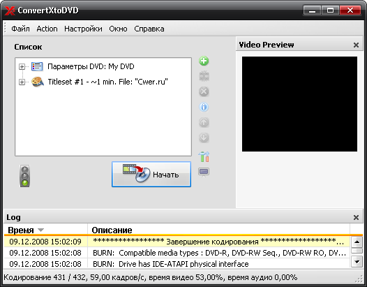ConvertXtoDVD - программа предназначена для преобразования видео в формат, совместимый с DVD Video, и последующей записи содержимого на DVD. Программа поддерживает видеофайлы Mpeg, Mpeg, Mpeg4, MP4, VOB, WMV, DV, AVI, а также потоковое видео. Для работы программы не нужны внешние AVI-кодеки, поскольку она использует собственные. ConvertXtoDVD может автоматически создавать фрагменты (chapters), поддерживает наличие нескольких аудиодорожек, работает с субтитрами (.SRT .SUB/IDX .SSA). Также программа поддерживает создание несложного меню для DVD, в котором можно установить фон, выбрать цвет и другие параметры шрифта для надписей.