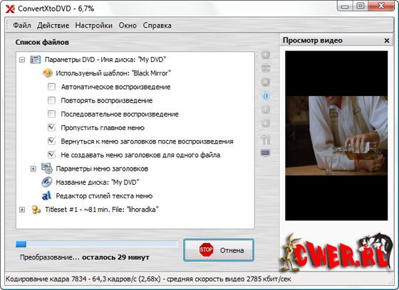 ConvertXtoDVD - программа предназначена для преобразования видео в формат, совместимый с DVD Video, и последующей записи содержимого на DVD. Программа поддерживает видеофайлы Mpeg, Mpeg, Mpeg4, MP4, VOB, WMV, DV, AVI, а также потоковое видео. Для работы программы не нужны внешние AVI-кодеки, поскольку она использует собственные. ConvertXtoDVD может автоматически создавать фрагменты (chapters), поддерживает наличие нескольких аудиодорожек, работает с субтитрами (.SRT .SUB/IDX .SSA). Также программа поддерживает создание несложного меню для DVD, в котором можно установить фон, выбрать цвет и другие параметры шрифта для надписей. Программа имеет русский интерфейс.