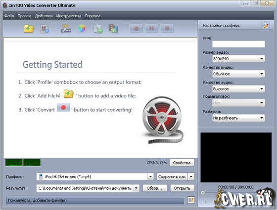 ImTOO Video Converter Ultimate - программа позволяет конвертировать видео. Поддерживает работу практически со всеми популярными видео форматами, такие как: AVI, WMV, MPEG-1/2/4, MOV, 3GP, ASF, MP4, MP2, MP3, WMA, WAV, M4A, AAC, AC3 и OGG, с возможностью кодирования и декодирования High-Definition видео.