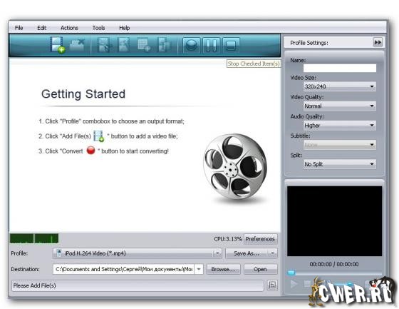 Мощный и универсальный видео конвертер. Поддерживает большинство популярных видео форматов, в том числе DVD, VCD, SVCD, MOV, RM, AVI, MPEG, MPEG1, MPEG2, MPEG4, WMV, 3GP и других, извлечение аудио из видео в MP2, MP3, AC3, RA, M4A, OGG, AAC и другие форматы, пакетный режим конвертирования, предварительный просмотр во встроенном проигрывателе, выбор и настройка аудио и видео кодеков, настройка параметров конвертирования, простой и удобный интерфейс.