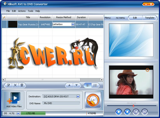 Xilisoft AVI to DVD Converter – это быстрая и простая в использовании программа для создания DVD, которая может конвертировать AVI, MPEG, DivX в DVD и записывать AVI на DVD диск, воспроизводимый на домашнем плеере DVD. Она позволяет вам определить систему NTSC или PAL, настроить 4:3 или 16:9 видео, и записать или весь DVD диск или ISO файл.