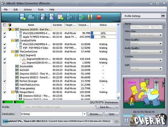 Xilisoft Video Converter - мощный и универсальный видео конвертер. Поддерживает большинство популярных видео форматов, в том числе DVD, VCD, SVCD, MOV, RM, AVI, MPEG, MPEG1, MPEG2, MPEG4, WMV, 3GP и других, извлечение аудио из видео в MP2, MP3, AC3, RA, M4A, OGG, AAC и другие форматы, пакетный режим конвертирования, предварительный просмотр во встроенном проигрывателе, выбор и настройка аудио и видео кодеков, настройка параметров конвертирования, простой и удобный интерфейс.