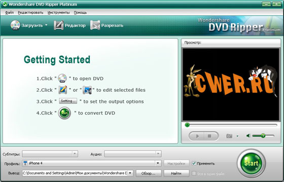 Wondershare DVD Ripper Platinum - удобный в работе и мощный DVD риппер, который может преобразовать кинофильмы DVD во все популярные видео и звуковые форматы, такие как MP4, M4V, AVI, WMV, MOV, 3GP, 3G2, MPEG, FLV, WMA, M4A, MP3, AC3, WMA, ASF, Vob, и т.д. с превосходным качеством и быстрой скоростью. Поддерживает почти все портативные видео/аудиоплейеры, что позволяет Вам легко редактировать DVD к iPod, Zune, iPhone, apple, PSP, Xbox 360, PS3, Archos, iRiver PMP , PMP, MP4/MP3, мобильным телефонам, Карманным PC, PDA, и т.д. Вы можете настроить размер файла, формат файла, и даже объединить несколько видео в 1 файл. С Wondershare DVD Ripper, Вы можете захватить любые картинки от вашего видео DVD и сохранить их как jpeg и bmp файлы.