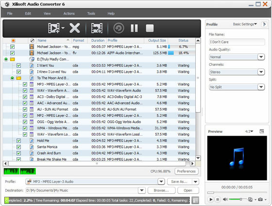 Xilisoft Audio Converter - программа для конвертации всех распространенных форматов аудио файлов, таких как MP3, WAV, M4A, WMA, MP4, WAV lossless, WMA lossless,FLAC, OGG и многие другие. Поддерживается пакетная конвертация, перенос информации из ID3-тегов, преобразование выделенного сегмента и извлечение аудио сегмента из видео файла, одновременная конвертация файла в различные форматы и разделение на несколько частей (функция Split File).