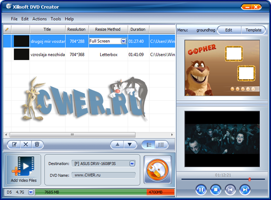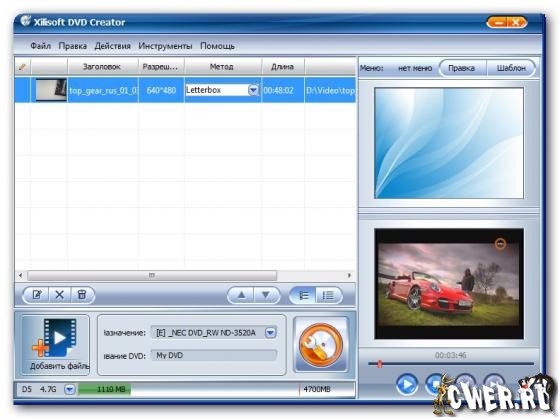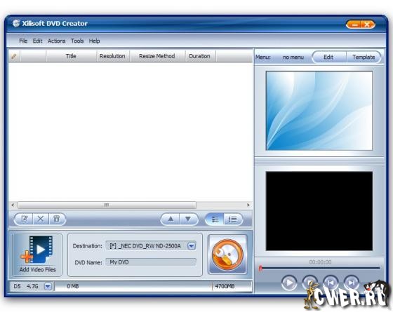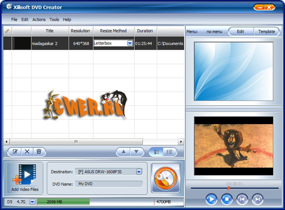 Xilisoft DVD Creator - программа для создания и записи (прожига) DVD с простым и удобным интерфейсом. Основные возможности: создание DVD с полноценными меню и субтитрами из AVI, MPEG, WMV, DV, DivX, Xvid, VOB, 3GP, 3G2, MP4 и других видеофайлов.