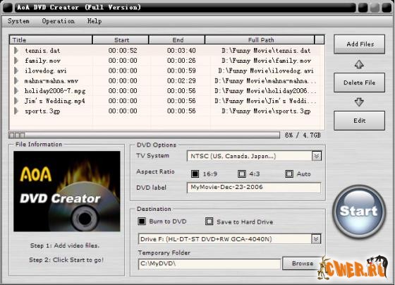 AoA DVD Creator - программа предназначена для создания DVD фильмов из обычных видеофайлов. Обеспечит Вам удобство в создании или преобразовании AVI, WMV/ASF, FLV (Flash Video), MP4, 3GP, MPEG/MPG, DAT и MOV в DVD, которые Вы можете смотреть на вашем домашнем DVD плеере. С AoA DVD Creator Вы сможете легко превратить каникулы, свадьбу и семейные кинофильмы в DVD диски, которые потом можно просматривать вместе с вашими друзьями и семьей!