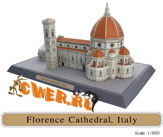 Италия. Провинция Тоскана. Город Флоренция. Кафедральный Собор Санта-Мария дель Фьоре или Дуомо (нач. строительства 1296 г., арх. Арнольфо ди Камбио). Кампанилла (колокольня, высота 85 м., арх. Джотто, строительство закончено 1359 г.). Базилика собора причислена к памяткам мирового наследия. Композиция состоит из трех корпусов: "Кафедрального собора", который славится своим огромным куполом и является четвертым по величине собором в мире, "Баптистерий Сан Джованни," - восьмиугольное здание, и "Колокольня Джотто". Фасад собора украшают прекрасные скульптуры и мозаики работ разных художников из белого, зеленого и красного мрамора.