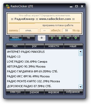 RadioClicker Lite - программа для приёма трансляций онлайн-радио. Кроме приёма радиостанций, RadioClicker позволяет настраиваться на просмотр различных телеканалов, осуществляющих вещание через интернет.