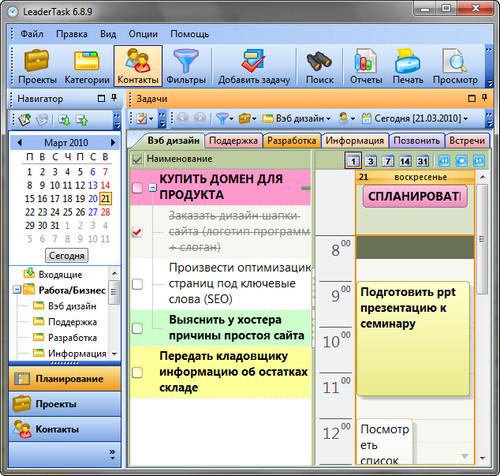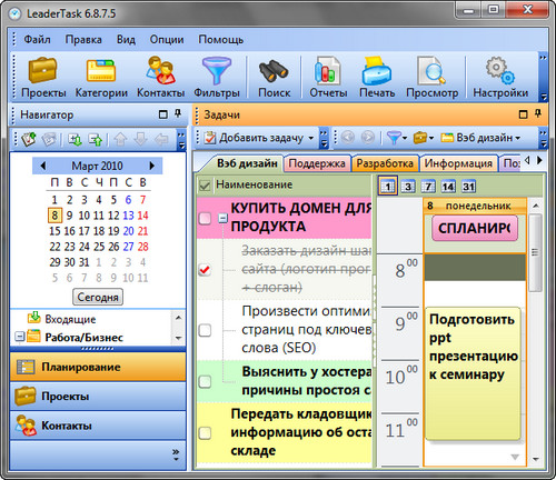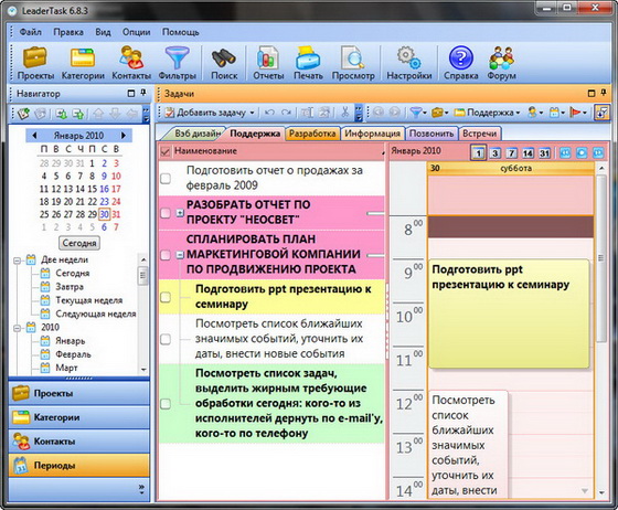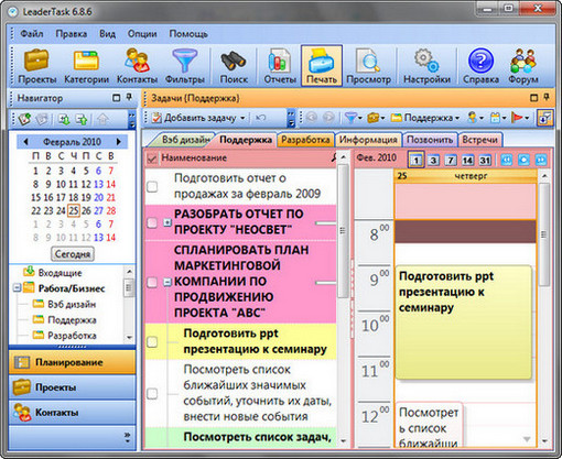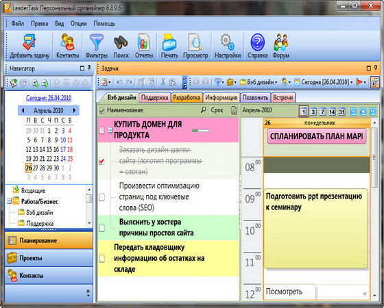 LeaderTask - это умный органайзер для лидеров! Интеллектуальная система управления проектами, событиями, задачами, контактами, освободит вас от рутины и даст больше времени для творчества. LeaderTask поможет вам избавиться от различных поглотителей времени, поможет вам увидеть четкую перспективу жизни, иметь подробный обзор дел, задач, вы будете ставить более высокие цели и достигать их. Кроме того, LeaderTask - это еще и удобный менеджер проектов, с помощью которого можно легко планировать и управлять вашими личными делами, а также бизнес проектами.