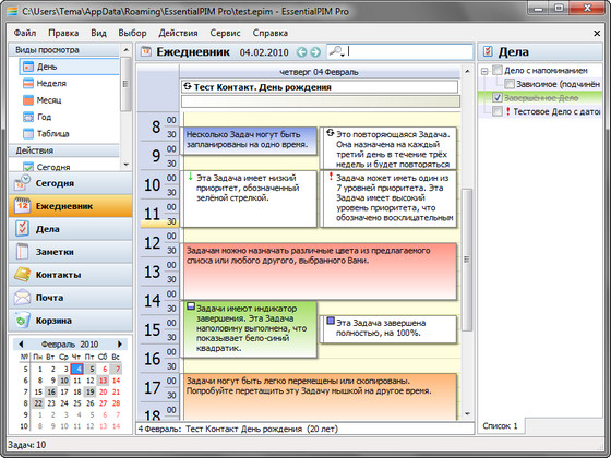 Программа имеет приятный и удобный в использовании интерфейс, позволяет сортировать задачи по времени и важности, интегрируется с MS Outlook/Outlook Express, поддерживает возможности Drag & Drop, имеет записную книжку для самых неотложных дней, генерирует отчеты в форматах HTML...