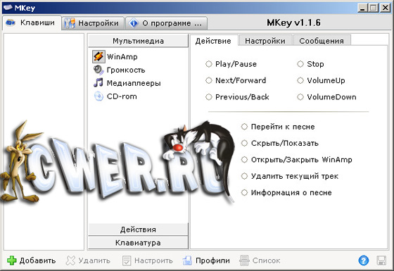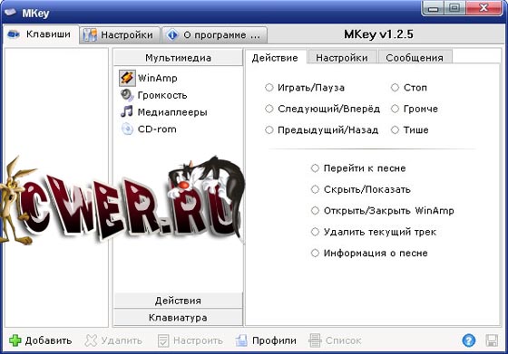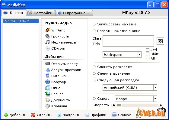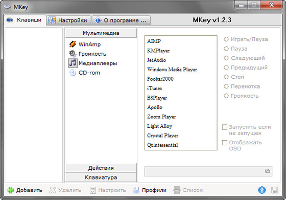 В первую очередь программа MKey (MediaKey) служит для настройки действий при нажатии на дополнительные клавиши мультимедийных клавиатур. Так же программу можно использовать при работе с обычными клавиатурами без дополнительных клавиш. Возможность назначить комбинации клавиш в сочетании с модификаторами Ctrl, Shift, Win и Alt.