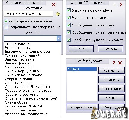 Swift Keyboard - небольшая программка для создания горячих клавиш. Она сочетает в себе простоту и оригинальность исполнения рабочего интерфейса, функциональность и надёжность. Установив эту программу на компьютере, можно назначать множество новых действий не предусмотренных в Windows. Вы указываете сочетание клавиш и устанавливаете для этого сочетания действие, после этого программа запоминает сочетание и указанное для него действие, и если в дальнейшем при работе вы нажмёте одно из запомненных программой сочетание клавиш, то произойдет нужное вам действие. Используя эту программу вы сможете быстро автоматизировать и ускорить свою работу и тем самым экономить своё время.