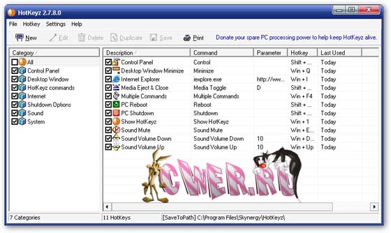 Hotkeycontrol - это утилита для привязки к комбинациям горячих клавиш практически любого процесса: запуск и закрытие программ, выключение и перезагрузка компьютера, присвоение целых строк текста для вставки, управление CD-приводом, громкостью и многого другого. Она превратит вашу обычную клавиатуру в мультимедиа девайс.