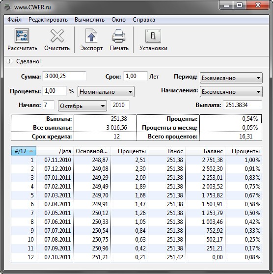 Loan Calc – это простая в использовании программа для расчета суммы взносов по кредиту или ипотечному займу. С помощью данного инструмента можно рассчитать сумму выплат, ежемесячный и общий проценты, а также составить подробный график выплат. Loan Calc работает с любой валютой: долларами, евро, фунтами и т.д. Главное использовать корректный разделитель десятичных долей: точку или запятую, в зависимости от того, что используется в вашей системе.