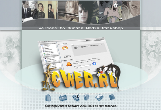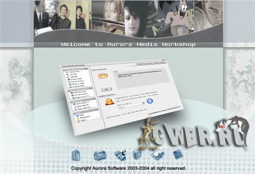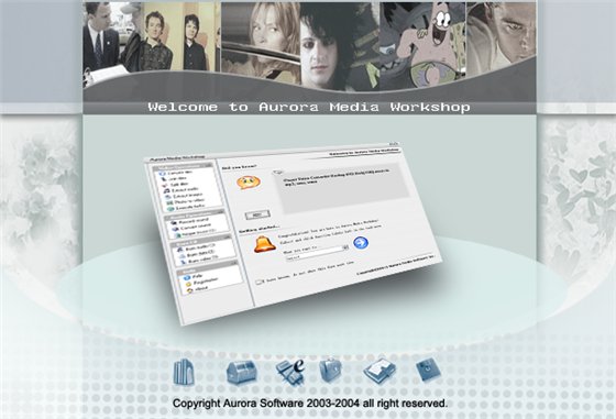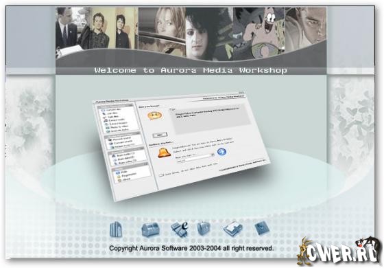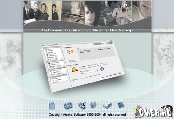 Aurora Media Workshop - является программой, включающий в себя полный спектр средств для работы с видео и аудио файлами. Аудио и видео конвертер, нарезка и соединение треков, граббер аудио CD, извлечение аудио из видео файлов, прожиг CD, создание видео CD из набора фотографий с множеством эффектов перехода, извлечение картинок (фреймов) из видео файлов, граббер DVD (VOB, DAT) в видео форматы, а аудио в MP3, WMA, WAV форматы, поддержка: AVI, MPEG1, MPEG2, ASF, WMV, VOB, DAT, DivX, XviD, MP3, WMA, WAV, OGG и других форматов.