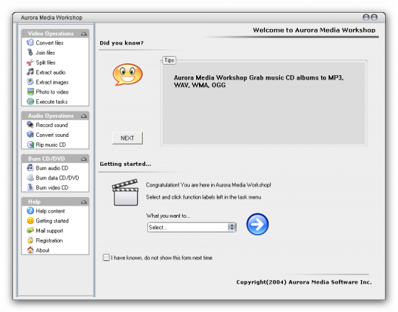 Aurora Media Workshop является программой, включающий в себя полный спектр средств для работы с видео и аудио файлами. Аудио и видеo конвертер, нарезка и соединение треков, граббер аудио CD, извлечение аудио из видео файлов, прожиг CD, создание видео CD из набора фотографий с множеством эффектов перехода, извлечение картинок (фреймов) из видео файлов, граббер DVD (VOB, DAT) в видео форматы, а аудио в MP3, WMA, WAV форматы, поддержка: AVI, MPEG1, MPEG2, ASF, WMV, VOB, DAT, DivX, XviD, MP3, WMA, WAV, OGG и других форматов.