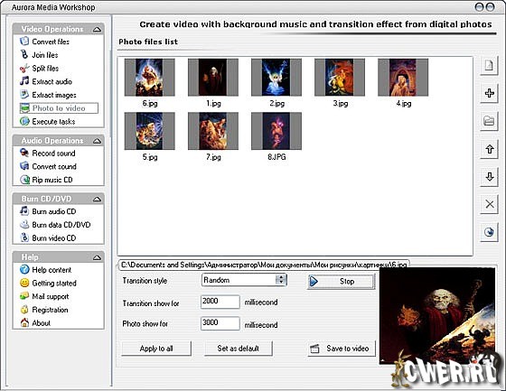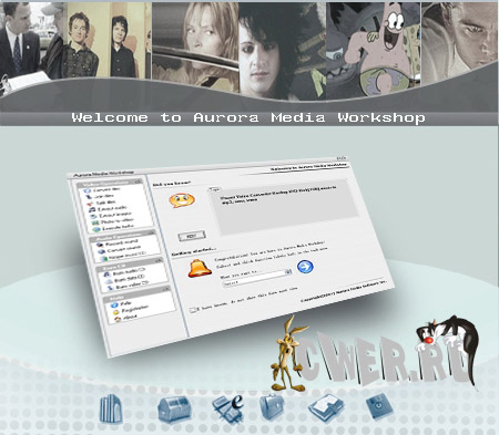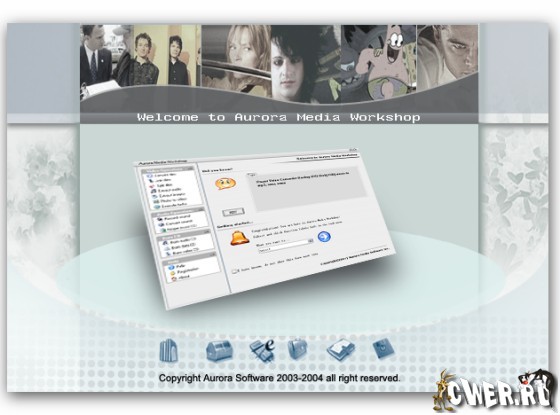 Aurora Media Workshop является программой, включающий в себя полный спектр средств для работы с видео и аудио файлами. Аудио и видеo конвертер, нарезка и соединение треков, граббер аудио CD, извлечение аудио из видео файлов, прожиг CD, создание видео CD из набора фотографий с множеством эффектов перехода, извлечение картинок (фреймов) из видео файлов, граббер DVD (VOB, DAT) в видео форматы, а аудио в MP3, WMA, WAV форматы, поддержка: AVI, MPEG1, MPEG2, ASF, WMV, VOB, DAT, DivX, XviD, MP3, WMA, WAV, OGG и других форматов. Короче целый мультимедийный комбайн!!!
