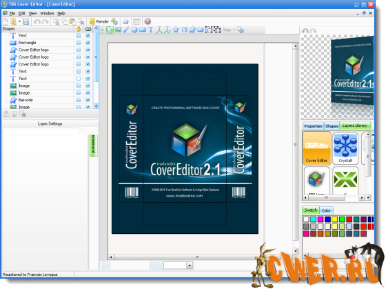 TBS Cover Editor - многофункциональная программа для создания и редактирования обложек и 3D коробок для ваших продуктов. Отличительной особенностью этой программы является возможность представления коробки во время редактирования в качестве развёртки её всех сторон одновременно с отображением её готового трехмерного вида, мгновенно меняющегося согласно сделанным изменениям в обложке коробки. Каждый объект на обложке создается в качестве отдельного слоя и вы даже сможете применять к нему различные эффекты, такие как внешняя и внутренняя подсветка, наложение тени от объекта, градиенты и т.д. Ещё одно не мало важное достоинство редактора - это базово заложенный богатый набор шаблонов вида коробок. Помощник программы после выбора вами понравившегося шаблона и ввода имени продукта и фирмы, пошагово доведет вас до конечного результата. В отличие от других аналогичных программ, рендеринг результата проходит очень быстро и вы сможете сохранить результат в один из графических форматов.