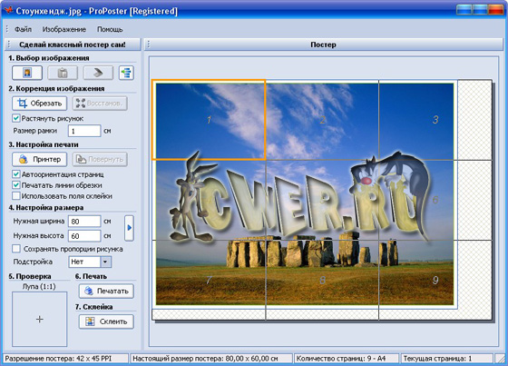 Программа ProPoster предназначена для распечатки плакатов стандартного (А0, А1, А2, А3) или заданного пользователем формата на листах меньших форматов. Программа автоматически разбивает изображение на нужное количество страниц. С помощью программы можно распечатать плакат, фотообои, рекламный щит размером до 10 х 10 м. Для склейки плаката дополнительно потребуется клей, ножницы и немного умения. Программа будет полезна всем, особенно студентам для распечатки черновых листов и препринтов курсовых и дипломных работ.