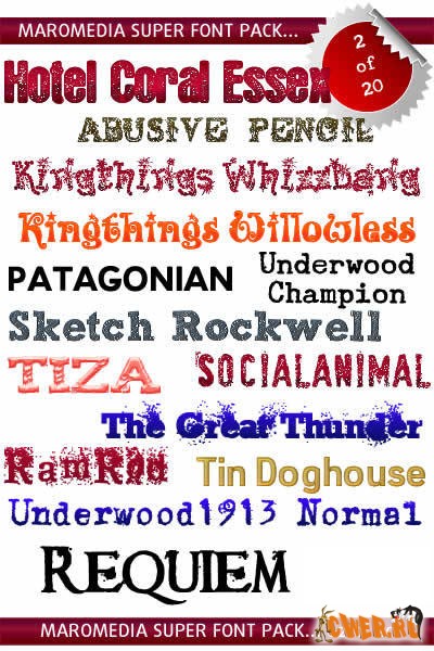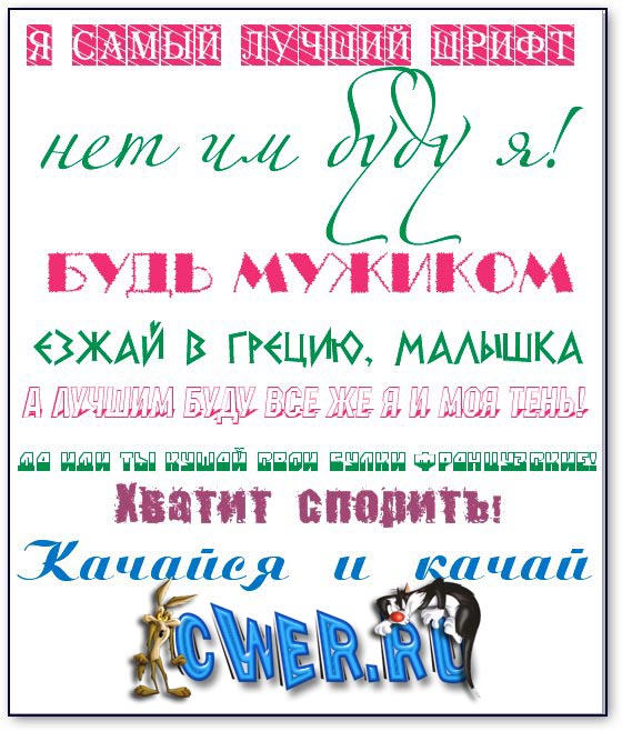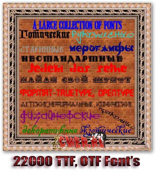 Коллекция шрифтов для всех Windows. В сборник вошли: 337 декоративных и рукописных, 403 из фильмов, книг, игр, известних брендов, известних груп, марок авто и 1585 кириллических шрифтов.