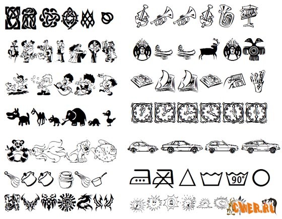 Подборка символьных шрифтов, разнообразной тематики: Музыкальные инструменты, Спорт, Праздники, Символы, Растения, Знаки зодиака, Животный мир, Автомобили, Предметы, Орнаменты и т.д.