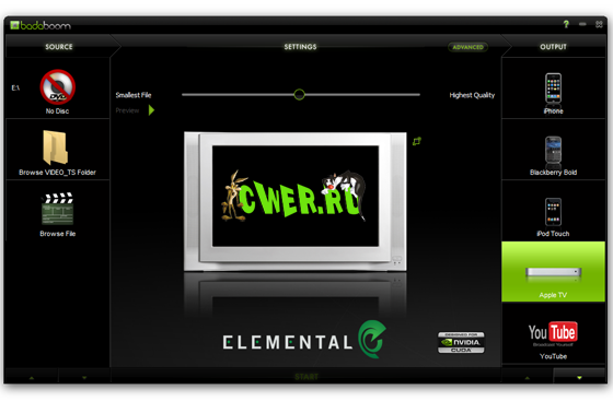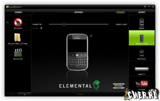 Badaboom Media Converter - первый в мире конвертер форматов, использующий технологии графических процессоров NVIDIA, позволяющий разгрузить основной процессор для других задач. Теперь нет причин для переноса просмотра фильма, обработки в Photoshop своих фотографий или других ресурсоемких заданий одновременно с конвертированием в AVCHD, ведь часть будет выполняться процессорами GPU. К сожалению данная программа рассчитана только на счастливых владельцев видеокарт на базе процессоров от NVIDIA поддерживающих технологию CUDA.