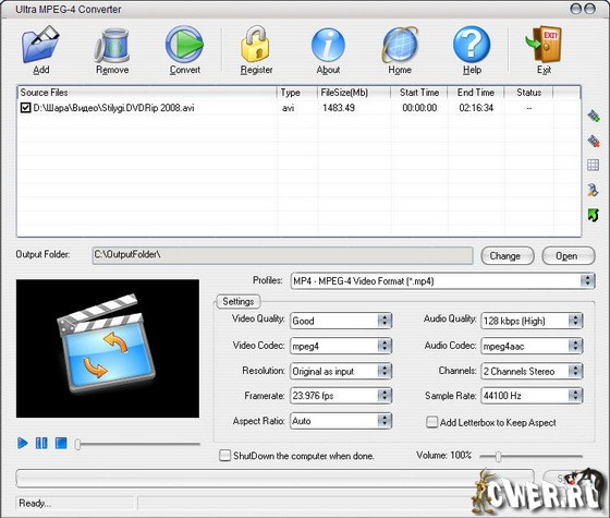 Ultra MPEG-4 Converter – это профессиональный MPEG-4 конвертер и MPEG-4 кодировщик, который поможет вам преобразовывать все видео файлы в MPEG4/AVC форматы. Данная удобная программа видео конвертирования подойдет для вашего портативного MP4 проигрывателя, iPod, PSP, PS3, Zune, XBOX 360, Archos, сотового телефона, карманного компьютера, Palm и т.д.Данная программа конвертирования поддерживает преобразования с различных форматов, таких как: DivX, XviD, AVI, WMV, MPG, MPEG, MP4, M4V, FLV, 3GP, ASF, RM, RMVB, MOV,MOD, ASX, MKV, OGM, SVCD, VCD, VOB в 3GP/AVI/DIVX/MP4/AVC/MOV/ASF/WMV.
