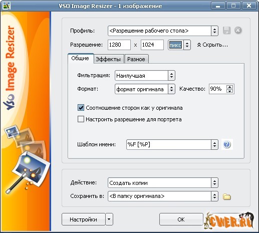 VSO Image Resizer - бесплатная программа для изменения размеров цифровых картинок и изображений в различных графических форматах (на данный момент поддерживается работа с файлами JPEG, GIF, BMP, TIFF, CR2, NEF и т.д.). Также в утилите имеются возможности для компрессии файлов, конвертирования из одного формата в другой, экспорта, наложения прозрачных прозрачных и управления картинками. VSO Image Resizer интегрируется в оболочку Windows, может работать в пакетном режиме, обладает расширенными опциями настройки для продвинутых пользователей.