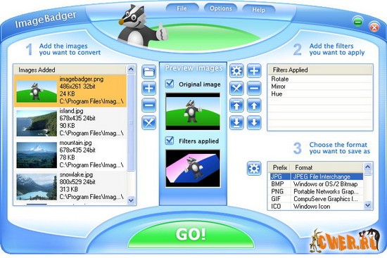 Программа для обработки и преобразования изображений. С помощью программы ImageBadger Deluxe 4.88 можно конвертировать изображения в заданные форматы, добавляя при этом различные эффекты. ImageBadger Deluxe 4.88 имеет большое разнообразие фильтров, которые помогут это осуществить (более 40 фильтров), поддерживает пакетную обработку изображений, более 150 графических форматов.