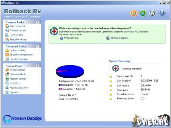 Вышла новая версия самой популярной программы - RollBack Rx, которая поможет защитить ваш компьютер от сбоя , неправильно установленного драйвера, поражения любого вируса, и вернуть обратно исправную систему за считанные минуты. RollBack Rx™ не влияет на производительность и занимает всего 0.07 % диска, и при этом позволяет без перезагрузки сделать автоматически или вручную менее чем за 3 секунды полный снимок системы, всего таких снимков можно сделать до 60 000, в любой из которых вы можете быстро вернуться или вернуть из них утерянные или разрушенные данные.