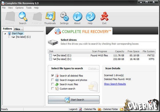 Complete File Recovery - универсальная программа для восстановления случайно удаленных файлов на вашем компьютере. Универсальность программы заключается в том, что вам не нужно устанавливать отдельные приложения для восстановления удаленных данных, что восстановить музыку, изображения, видео или документы. С помощью данной программы вы сможете восстановить файл любого типа - будь то музыкальный трек, видео клип или памятная фотография. Программа сможет восстановить удаленные данные не только с жесткого диска компьютера, но и с других цифровых носителей, например, с USB флэш диска, MP3 плеера, карты памяти и фото или видео камеры.