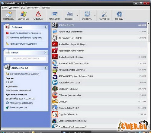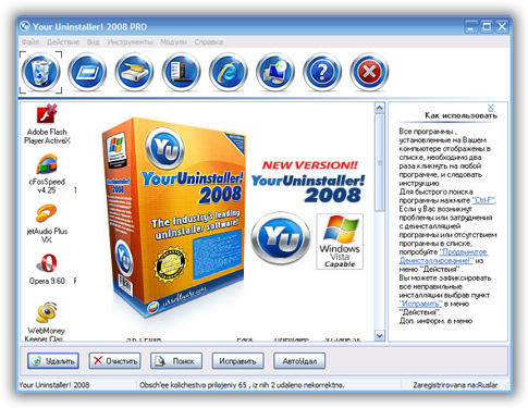 Your Uninstaller! - Обеспечивает решение задач по деинсталляции приложений, установленных на вашем компьютере. Он служит заменой стандартному диалогу Добавить/Удалить программу Windows. При этом работает приблизительно в 5-10 раз быстрее. Может показывать соответствующие значки приложений. Имеется функция поиска приложения по ключевому слову. Your Uninstaller! автоматически обнаруживает неисправные ключи реестра и полностью удаляет их по вашему разрешению. Возможно ручное удаление записей об установленных программах из системного реестра.