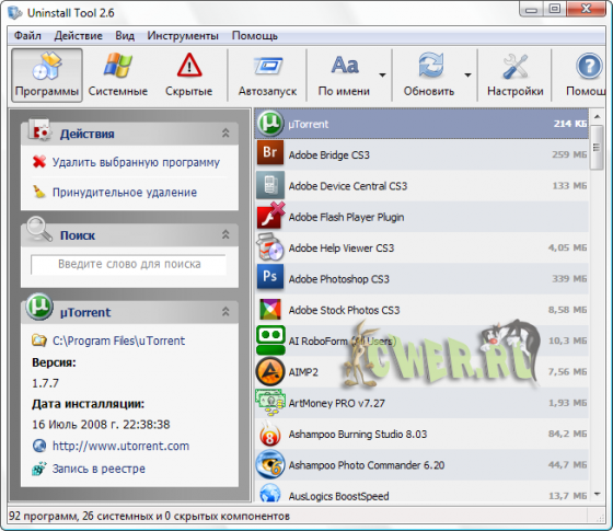 Smarty Uninstaller 2008 - Обеспечивает решение задач по деинсталляции приложений, установленных на вашем компьютере. Он служит заменой стандартному диалогу Добавить/Удалить программу Windows . При этом работает приблизительно в 5-10 раз быстрее. Может показывать соответствующие значки приложений. Имеется функция поиска приложения по ключевому слову.
