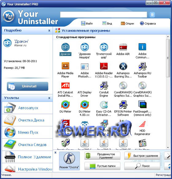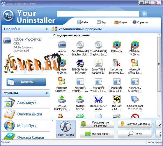 Your Uninstaller! обеспечивает решение задач по деинсталляции приложений, установленных на вашем компьютере. Подсвечивает недавно установленный «софт» и автоматически вычищает оставшиеся после удаления ключи реестра и файлы. Уборка мусора, впрочем, одними приложениями не ограничивается. Также можно запросить список автоматически загружаемых программ и контекстное меню Internet Explorer. Может показывать соответствующие значки приложений. Имеется функция поиска приложения по ключевому слову. Автоматически обнаруживает неисправные ключи реестра и полностью удаляет их по вашему разрешению. Возможно ручное удаление записей об установленных программах из системного реестра. Имеет приятный и удобный пользовательский интерфейс, также программа имеет русскоязычный интерфейс.