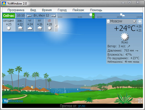YoWindow - современная утилита для отображения прогноза погоды, это необычная и уникальная программа при помощи неё вы можете не смотря на цифры определить погоду, потому что все погодные условия отображаются на красивом изображении в точности до расположения солнца. Вся погода на картинке реальна будь то облачность, дождь, снег, туман, трава движется вместе с ветром. Картинка проживает свою виртуальную жизнь и отображает реальные данные с природными явлениями и сменой дня на ночь.