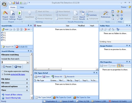Duplicate File Detective - программа для удаления дубликатов файлов. Она позволяет сканировать папки, разделы жесткого диска, съемные носители, а также папки, находящиеся на общем доступе в сети. Все найденные файлы сортируются по расширениям, а при отображении статистики отображаются графики по типам найденных файлов. Полученные результаты можно экспортировать в форматы HTML, CSV и XML. Duplicate File Detective обладает интуитивно понятным интерфейсом, а также содержит большие возможности по сортировке полученных результатов.