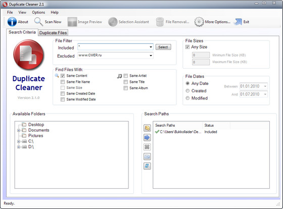 Программа для поиска и удаления дубликатов файлов. В DuplicateCleaner с помощью удобного мастера поиска, а также наличия разнообразных фильтров (поиск по содержимому, названию, расширению файла, по тегам музыкальных дорожек и т.д.), от "внимания" программы не ускользнёт ни один дубликат.