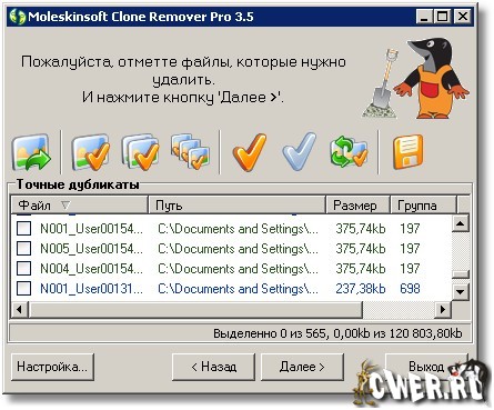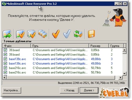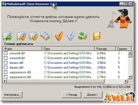 Обновилась программа для поиска дубликатов файлов - MoleskinSoft Clone Remover. Она поможет найти одинаковые файлы, находящиеся в разных «местах» (жестких дисках, CD, DVD и т.д.) вашего компьютера, даже если названия файлов не совпадают. Равные по содержанию файлы есть на каждом компьютере с операционной системой Windows. И что с ними делать? Moleskinsoft Clone Remover поможет решить эту проблему.