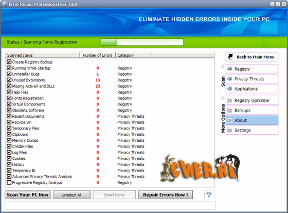 Error Repair Professional - это небольшая утилита для исправления ошибок в настройках операционной системы. Программа обладает высокой скоростью работы и за считанные секунды проверит ваш компьютер на наличие ошибочных записей и сама исправит их. Для продвинутых пользователей присутствует ручной режим работы. Найдет неполадки в реестре, библиотеках данных системы и приложений, а также серьезные ошибки, допущенные пользователем, ставящие безопасность системы под угрозу.
