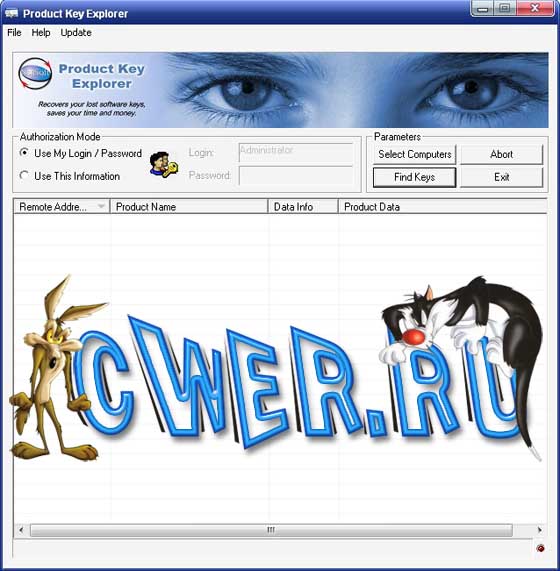 Product Key Explorer - программа позволяет расшифровать, увидеть и сохранить серийные номера продуктов Microsoft, CD-ключи установленных на компьютере программ, и не только их. Неполный список ПО, регистрационные данные которых можно увидеть и сохранить: Microsoft Windows (2000, XP, 2003, Vista), Microsoft Office 2003, Microsoft Office 2007, Microsoft Office XP, Microsoft Visual Studio 2005, Agnitum Outpost Firewall, Macromedia, Ahead Nero, Adobe Photoshop, CyberLink PowerDVD, Borland Delphi, Alcohol 120% и т.д. (поддержка более 500 программ). После запуска программы достаточно будет нажать кнопку поиска ключей и она сама просканирует реестр, и выдаст список программ, установленных на компьютере и регистрационные данные к нем. В программе есть окно для авторизации Администратора, если установлены ограничения на уровне пользователей. Может работать по сети с другими компьютерами и по заданному диапазону IP адресов или по списку IP в текстовом документе.