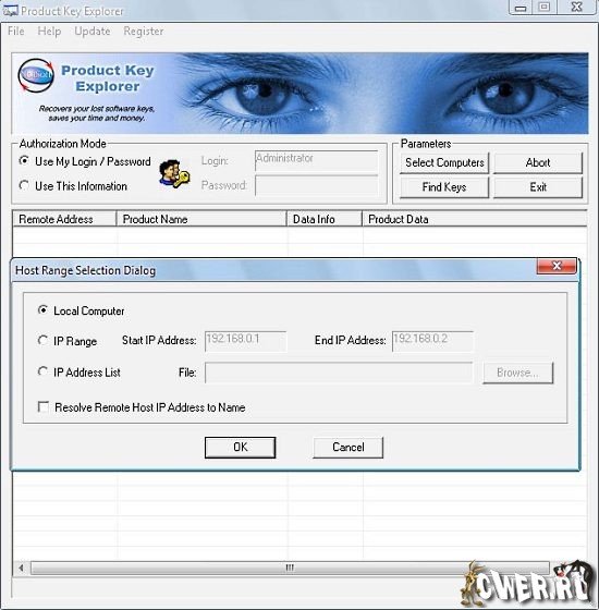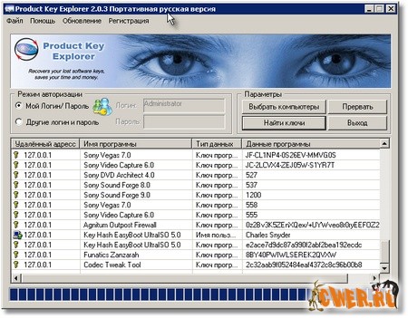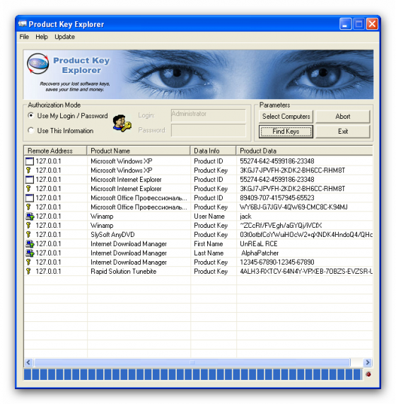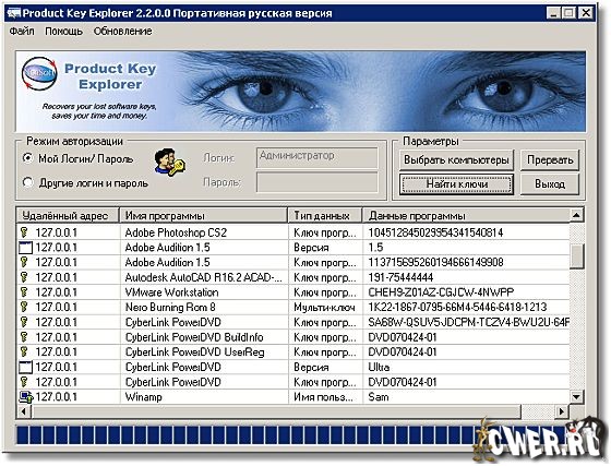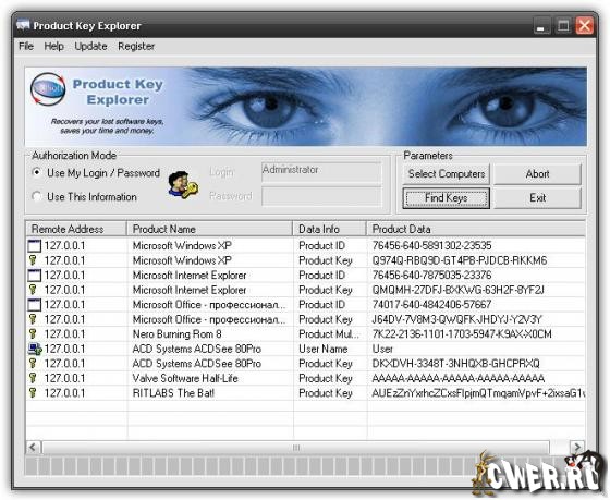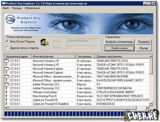 Product Key Explorer - позволяет расшифровать и увидеть,а также сохранить серийные номера (Product ID, Product Key, License Info, User Name, Company) продуктов Microsoft, CD-key установленных на компьютере программ, и не только их. Неполный список ПО, регистрационные данные которых можно увидеть и сохранить: Micrsoft Windows (2000, XP, 2003, Vista), Microsoft Office 2003, Microsoft Office 2007, Microsoft Office XP, Micrsoft Visual Studio 2005, Macromedia, Ahead Nero, Adobe Photoshop, CyberLink PowerDVD, Borland Delphi и т.д. (более 40 продуктов). После запуска программы достаточно будет нажать Find Keys и она сама просканирует реестр, и выдаст список программ, установленных на компьютере и регистрационные данные к нем. В программе есть окно для авторизации Администратора, если установлены ограничения на уровне пользователей. Может работать по сети с другими компьютерами и по заданному диапазону IP адресов или по списку IP в текстовом документе.