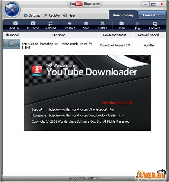 Wondershare YouTube downloader является очень простым в использовании инструментом видеозагрузки и конвертирования. Он имеет наиболее полный набор функций для загрузки видео, для архивации видео, а также для конвертации видео для iPod, iPhone, PSP, Apple TV, Zune, Pocket PC и многих других мобильных устройств.