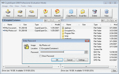 CryptoExpert - программа для создания виртуальных зашифрованных дисков, которые могут подключаться как обычные съемные диски. Принцип работы CryptoExpert состоит в том, что программа создает файл-контейнер, представляющий собой виртуальный зашифрованный диск, с которым можно работать, как с самым обычным жестким диском, так как шифрование-расшифрование происходит "на лету". Поддерживается криптостойкое шифрование (AES 256 bit, CAST 128 bit, 3DES 168 bit, Blowfish 448 bit), создание шифрованных дисков, доступных для работы по локальной сети, работа с USB-накопителями и многое другое.