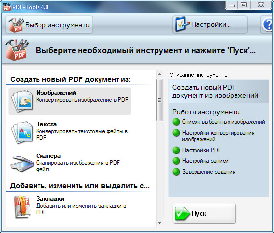 PDF-Tools — набор полезных инструментов для манипуляции с PDF файлами. С помощью данного набора вы сможете с легкостью создавать новые PDF документы из изображений, сканера и текстовых документов, изменять содержимое существующих PDF документов (добавление закладок, объединение и разъединение PDF файлов, извлечение страниц и изображений, оптимизация PDF документов, изменение настроек PDF документа, включая размер и разрешение страницы, конвертация PDF в оффисные документы и т.д.), а также отправлять и загружать файлы по почте или через FTP-соединения. Стоит упомянуть, что данная программа входит в состав PDF-XChange Pro. Все операции в программе осуществляются с помощью пошаговых мастеров. Интерфейс программы многоязычный и обладает поддержкой русского языка.