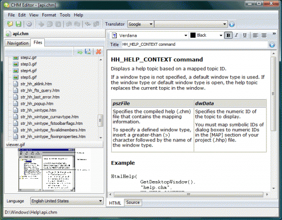 CHM Editor — это инструмент, который позволяет создавать, редактировать и переводить электронные книги и файлы справки в формате CHM. Простым пользователям будет удобен просто для чтения CHM файла на иностранном языке, а так же его сохранения в переводе или замены оригинальных файлов справки на переведенную версию. Для этого не надо обладать ни какими знаниями, нажал на кнопку и через пару секунд уже читаешь на родном языке. CHM Editor позволяет переводить любой CHM-файл, на множество языков, используя один из имеющихся сервисов перевода. Самое удивительное, что перевод будет выполняться с сохранением всех HTML-тегов и структуры документа.