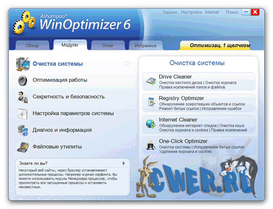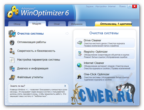 WinOptimizer - пакет программ, позволяющий оптимизировать операционную систему за счет ее настройки и очистки. Включает в себя утилиты для очистки жесткого диска и системного реестра, модуль для обеспечения защиты личной информации путем поиска и удаления файлов и данных, оставшихся после интернет-cepфингa, утилиту для оптимизации Интернет-соединения путем настройки Windows TCP/IP, модуль для настройки программ, автозагружаемых одновременно с запуском системы, а также модули для поиска и удаления ненужных файлов DLL, для безвозвратного удаления данных и для шифрования файлов. Кроме этого, Ashampoo WinOptimizer позволяет переназначать ассоциации файлов, шифровать/расшифровывать файлы, а также безвозвратно их удалять. Наконец, возможна настройка параметров системы и ее оптимизация за один клик - за это отвечает модуль “1-Click Optimization”.